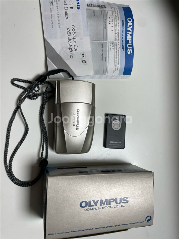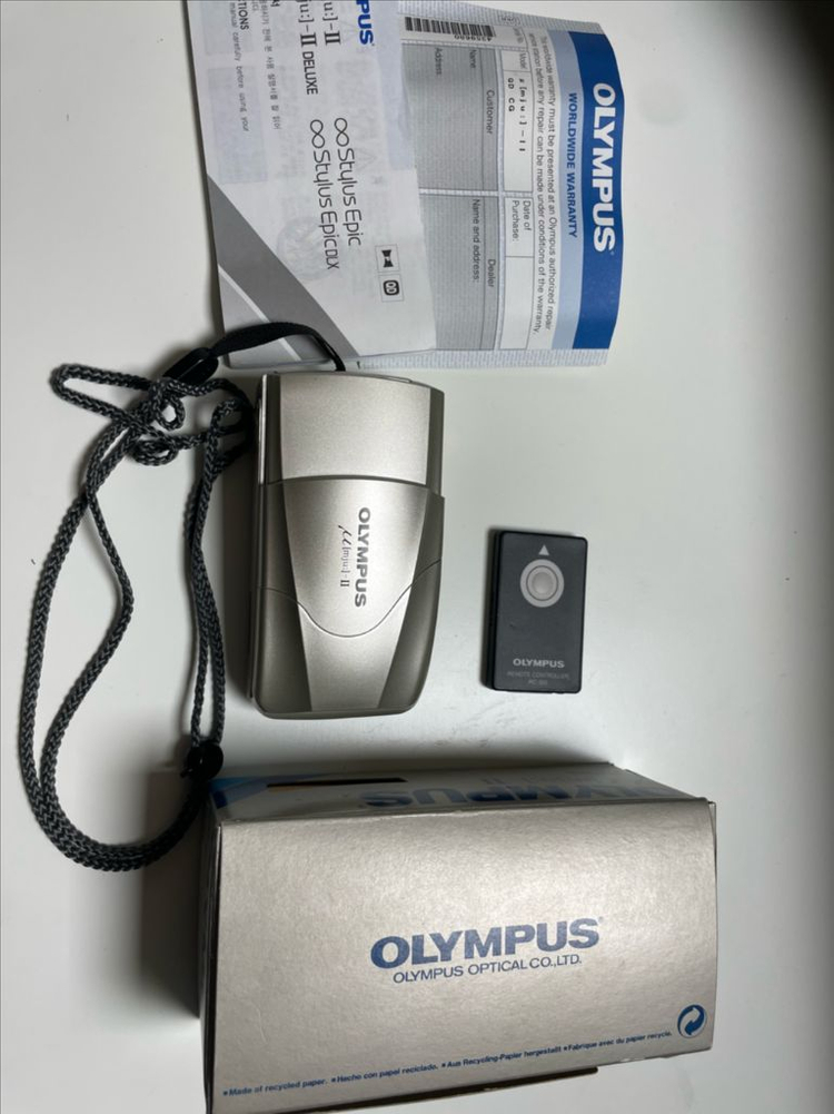 올림푸스 뮤[mju:]-II 필름 카메라입니다. 외관은 전체적으로 깨끗하고 빛샘없으며 전기능 잘작동됩니다. 35mm F2.8 렌즈가 장착되어 선명한 사진을 찍을 수 있고 현재 날짜로 데이터백 사용가능합니다. 생활 방수 기능이 있어 야외에서도 안심하고 사용할 수 있습니다. 구성품은 첫 구매했을때 그대로 카메라 본체, 스트랩, 리모컨, 설명서, 박스입니다. 소장하려다 다른카메라 구입에 보태기 위해 내놓습니다