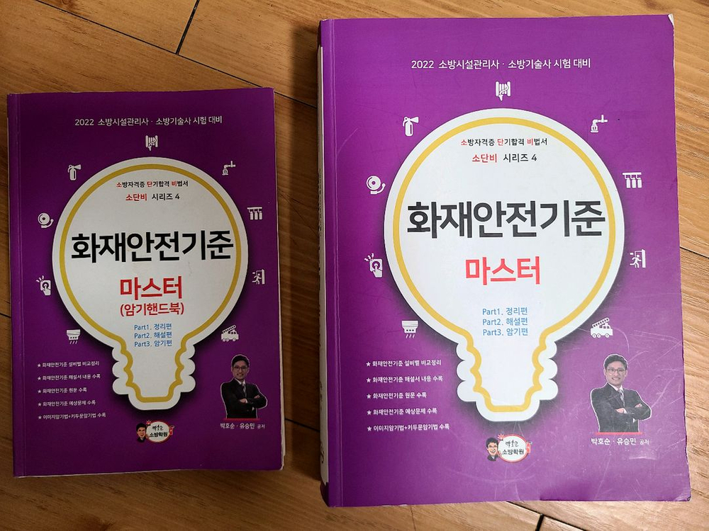 2022년소방시설관리사. 박호순. 화재인전기준 마스터 (암기핸드북포함)2022년 소방시설관리사 시험 화재안전기준 교재입니다. (박호순.유승민 공저) 마스터와 함께 구성된 완전한 세트로, 내부 상태도 깨끗하고 필기나 손상 전혀 없고 책 컨디션 매우 좋습니다. 소시사 암기핸드북은 암기를 어떻게 해야 하는지 감을 잡을수 있는 좋은 교재라 생각합니다. 암기법을 익히기에는 최고입니다. 수험생 어려분 화이팅요