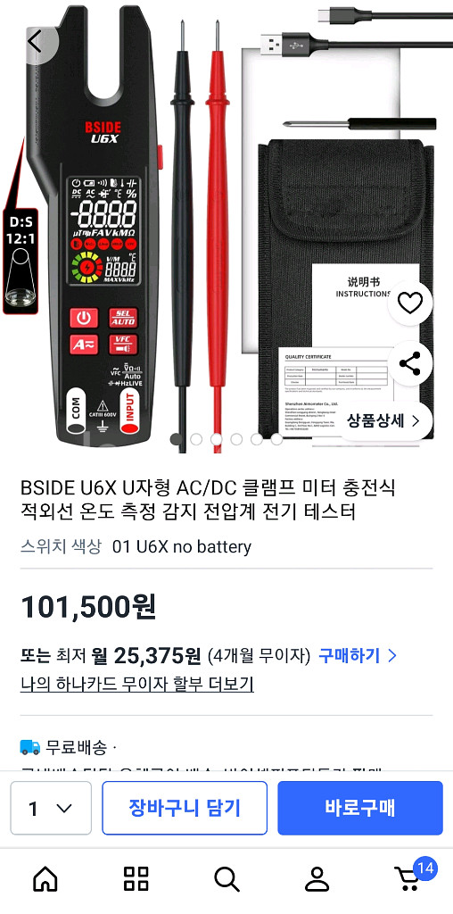 디지털 멀티미터. 전기테스터기. 전압계.전류계. 테스터기.전기테스터기. 전기회로. 테스터기 디지털 멀티미터 판매합니다. 케이스와 테스트 케이블 모두 포함되어 있고 상태 양호해요. 전기 작업이나 측정용으로 유용하게 사용하실 수 있습니다. BSIDE U6X 쿠팡에서는 10만원내외 판매중이며 알리익스프레스에서는 최저가 49달러에 판매중입니다. ㅡ 구매후 사용하지 않고 서랍에만 보관되어 있어서 판매합니다. 제품 매우 깨끗합니다. 거의 새상품급