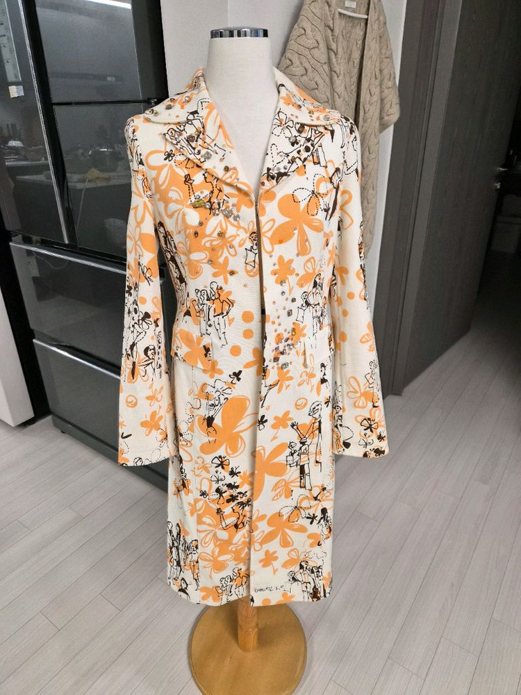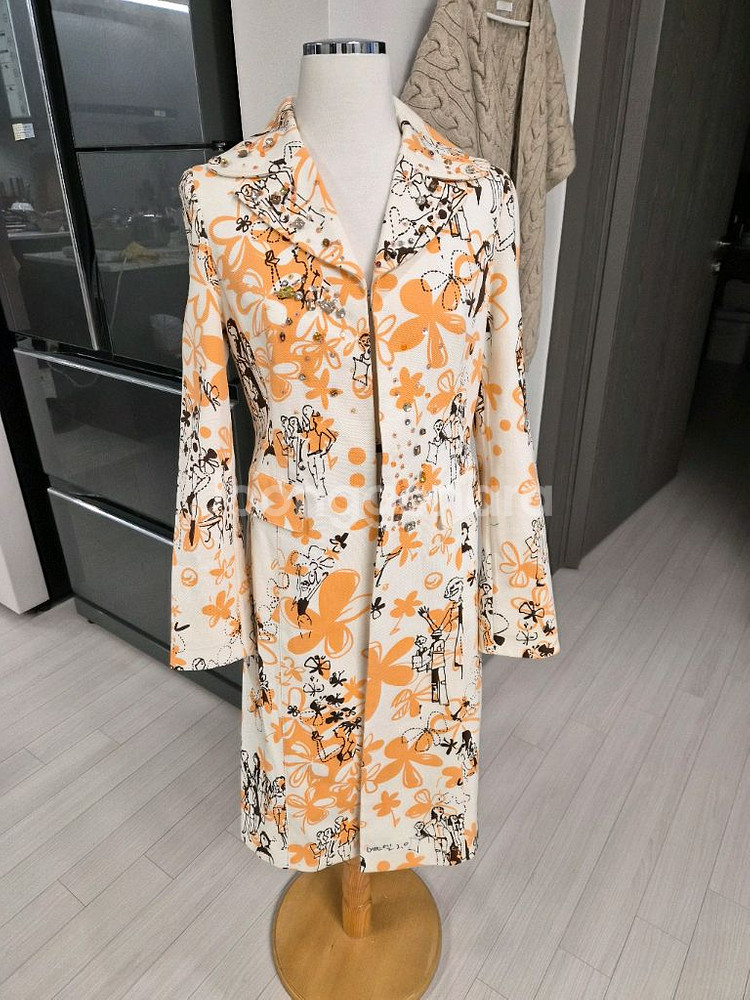 한국을 대표하는 디자이너 브랜드 **'손정완(SON JUNG WAN)'**의 아이덴티티가 가득 담긴 유니크한 롱 자켓입니다. 화이트 바탕에 오렌지 컬러의 화사한 플라워 패턴과 감각적인 인물 드로잉이 조화를 이루어 마치 하나의 예술 작품 같은 느낌을 줍니다. 특히 카라와 앞 라인을 따라 장식된 화려한 보석 비즈 디테일이 얼굴을 환하게 살려주며, 격식 있는 자리나 모임에서 주인공으로 만들어줄 아이템입니다. 브랜드: 손정완 (SON JUNG WAN) 사이즈: 호칭 55 (85-92-160) 가슴둘레: 85cm / 엉덩이둘레: 92cm / 신장: 160cm 기준 소재: 겉감 면 98%, 폴리우레탄 2% (탄탄하면서도 약간의 신축성이 있어 착용감이 편안합니다.) 특징: 고급스러운 보석/큐빅 비즈 장식 (수작업 느낌의 정교한 디테일) 유니크한 일러스트 & 플라워 패턴 허리 라인이 살짝 들어간 슬림하고 우아한 핏 안감이 있어 비침 걱정 없이 깔끔하게 떨어지는 실루엣 이 제품은 화려한 비즈 장식으로 출시 당시 약 100만원대 였어요~ 구입하고 보관만한 새상품 그대로입니다