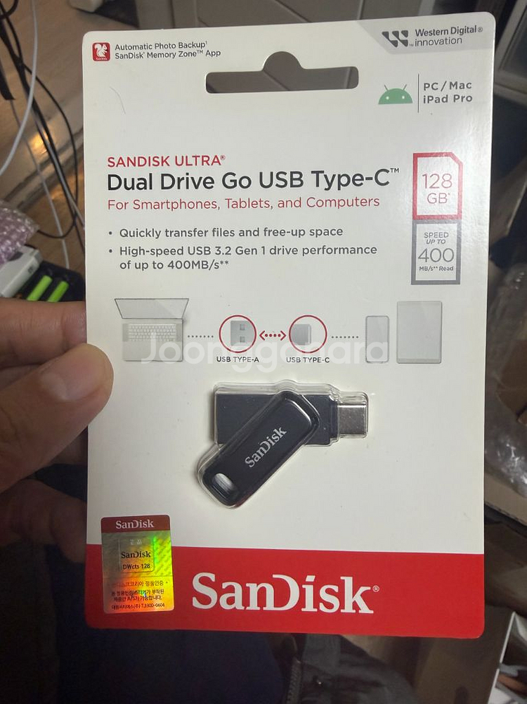듀얼 타입 USB 메모리 128GB 새제품이에요. PC/Mac/iPad Pro에서 사용 가능하고 읽기 속도 최대 400MB/s로 빠르게 전송할 수 있어요. 미개봉 상태로 깨끗합니다!