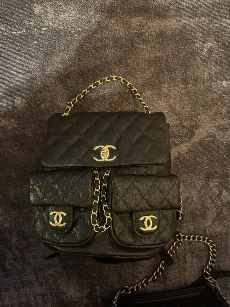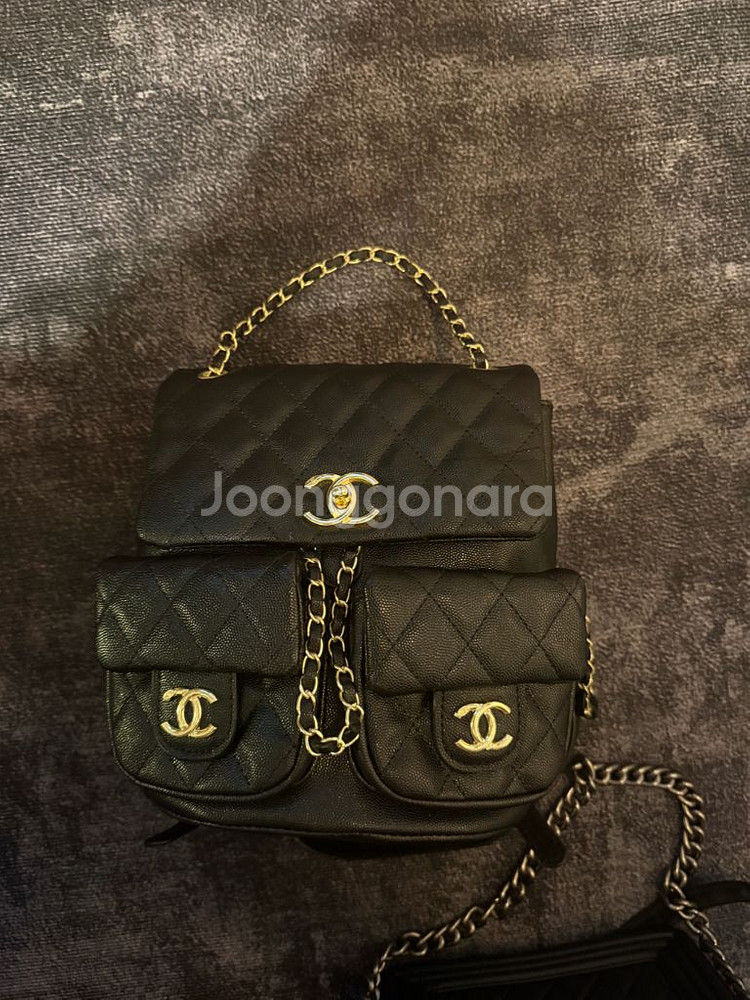 개인정보(거래정보)를 주고받는 행위는 사기에 노출될 수 있으므로 즉시 중고나라로 신고해 주세요시그니처 퀼팅 디자인의 블랙 가죽 백팩이에요. 골드 체인 스트랩과 로고가 포인트이고, 앞면에 작은 파우치도 함께 있어서 실용적이에요. 전체적으로 깔끔한 상태로 보관되어 있습니다.