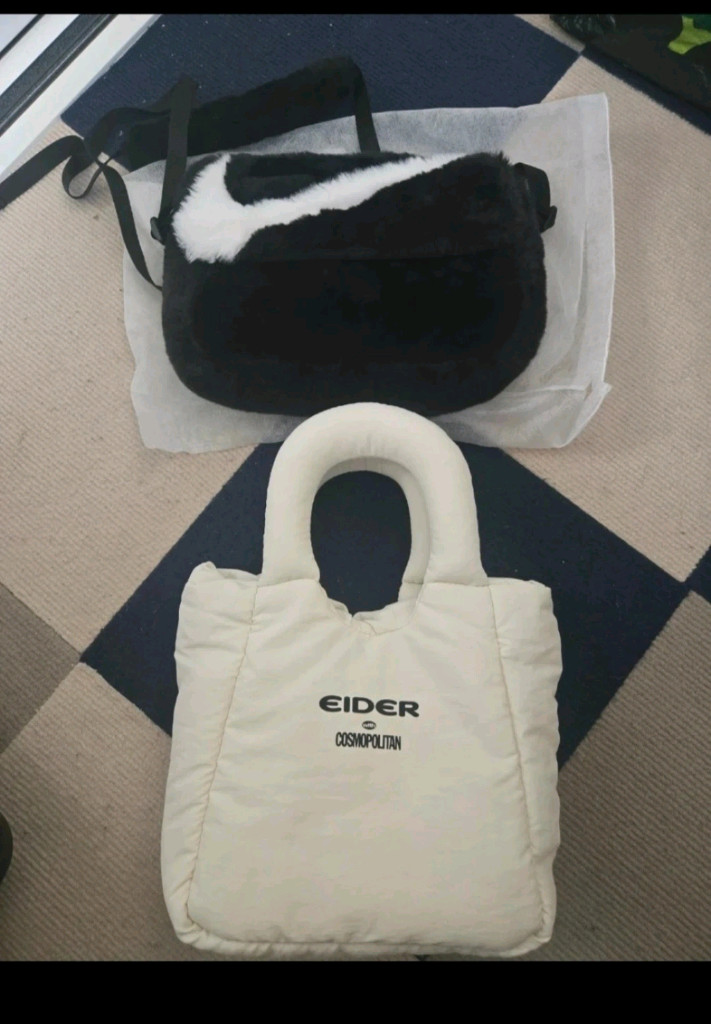 나이키 한번착용후 보관만 했네요. 거의 새거입니다. 나이키 푸츄라 퍼 크로스백 이구요. 가로26. 세로20정도 구요. 아이더 미니 패딩백은 미사용입니다. 아주 귀여운 가방입니다. 안전결제 하시면 됩니다.