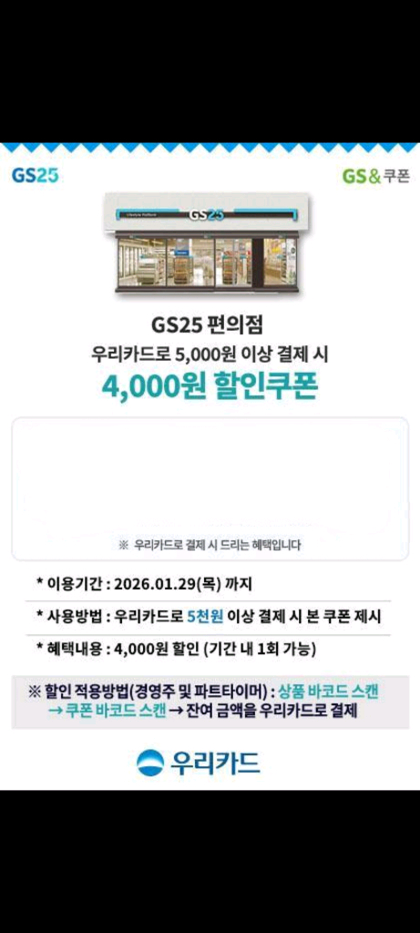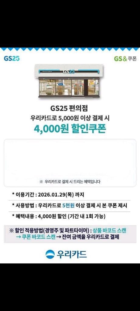 우리카드로 gs25편의점에서 5천원 이상 결제시 사용가능한 4,000원 할인쿠폰이에요. 유효기간은 2026년 1월 29일까지 주의사항 2번째사진 참고 반품불가