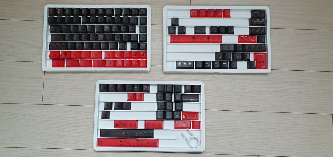 9만원으로 해외구매 했는데 제 키보드에 잘 안맞는거 같아서 하루만 이용하고 판매하기로 했어요 ㅠ.ㅠ 키캡은 PC 재질이고 키캡 142개 있어요. 여기에서 구매했어요: https://keysfusion.com/product/polka-dot-pc-translucent-keycaps-red-black/
