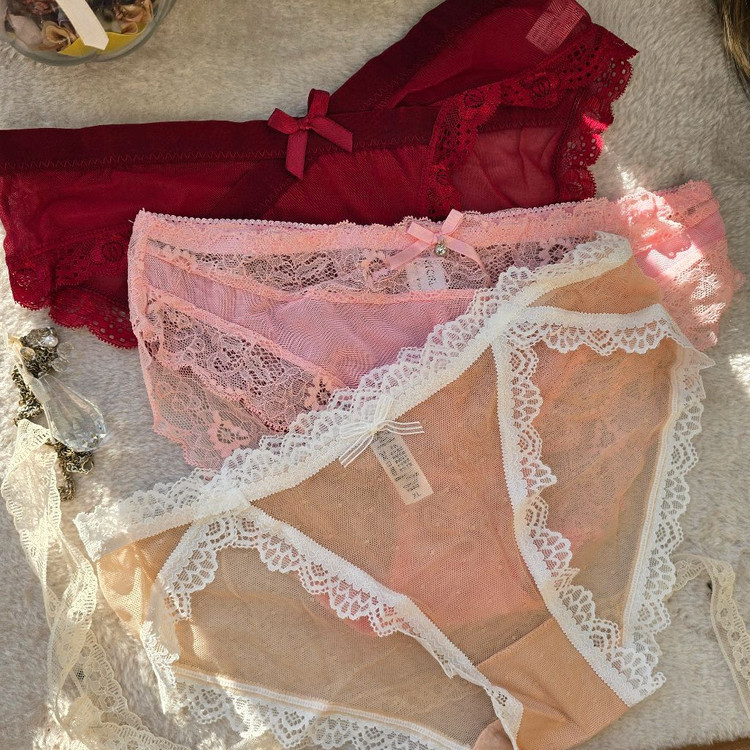 레이스 여성 팬티 3종 세트 새상품입니다 사이즈는 100사이즈입니다. 레드, 핑크, 베이지 3가지 색상으로 구성되어 있어요 각 팬티에는 섬세한 레이스 디테일과 귀여운 리본 장식이 있어 더욱 매력적입니다 시스루 디자인으로 섹시하면서도 부드러운 소재로 편안한 착용감을 제공합니다