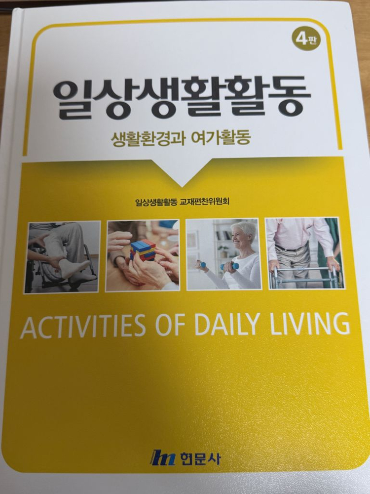 일상생활활동 교재 4판이에요. 생활환경과 여가활동 내용으로 구성되어 있고, 사진처럼 가끔 작은 메모나 밑줄 친 부분 좀 있는 정도고 깨끗한 편입니다. 택배비 포함 가격입니다