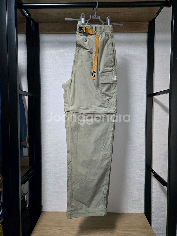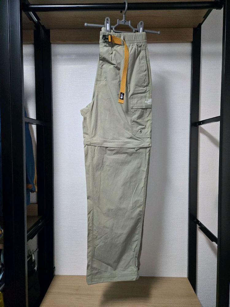 노스페이스 컨버터블 팬츠 카키색 80사이즈 허리 30인치 정도 됩니다 허리 밴딩이 있어 편안하고, 벨트도 포함되어 있습니다 지퍼로 다리 부분을 분리하여 반바지로도 활용 가능한 실용적인 제품이에요 면 54%, 나일론 42%, 폴리우레탄 4% 혼방 소재로 착용감이 좋습니다 허리둘레 80cm, 엉덩이둘레 111cm로 표기되어 있습니다 실착 5회 미만 거의 새상품