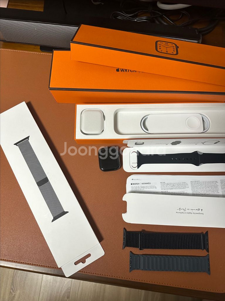 애플워치7 에르메스 에디션 45mm 판매합니다. 생활하면 생길 수 있는 작은 생활감은 있지만 떨어뜨린적 없으며 외관 찍힘이나 기능하자 없습니다. 배터리 효율은 83%입니다. 하루 충분히 사용하고 남습니다. 구성품은 사진에 보이는 것이 전부이며 아래 기재해 놓았습니다. 직거래는 전북 전주 가능합니다. 별도 문의 없을시 안전거래 구매신청 하시면 우체국 택배로 발송접수 해드리겠습니다. *구성품 • 워치 본체 • 충전 케이블 (정품 구성품/미사용) • 정품 에르메스 스포츠 스트랩(블랙/미사용) • 정품 밀레니즈 루프(그라파이트/1주일사용) • 서드파티 스트랩 2개
