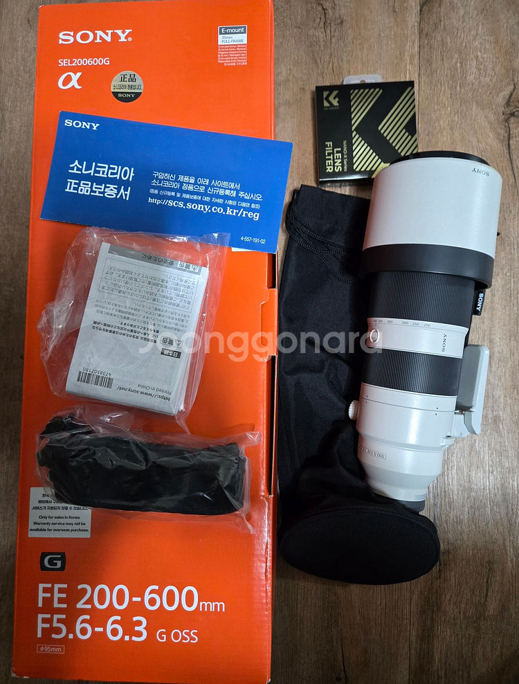 소니 200-600mm F5.6-6.3 G 렌즈입니다. 박스 상태 등 보시다시피 깨끗하구요. 렌즈도 전체적으로 깔끔합니다. 후드부분에 작은 기스 있고(사진에 올려뒀습니다.), 렌즈캡은 몇번 떨어뜨려서 기스 있습니다. 필터는 K&F NANO-X Series MRC UV 필터입니다. 안쓸때는 항상 제습함에 보관했습니다. 택배거래시 우체국 택배로 보내드립니다. 가능하면 직거래 하면 좋을 것 같아요.