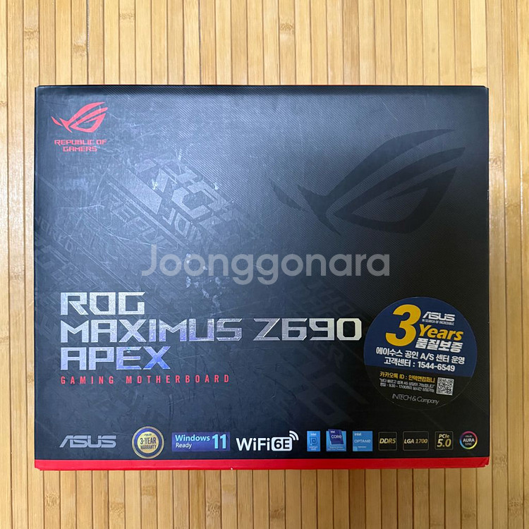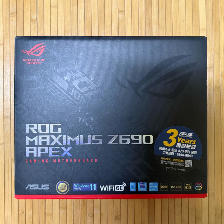 ASUS ROG MAXIMUS Z690 APEX - 2차 구매자 - 22년산 - 보증기간 만료 - 구성품 사진 참고 (DIMM.2 카드 없음) * 사진으로 잘 안보이는데 소켓 9시 방향 안쪽에 서멀 묻음 * 작동에는 이상 없음 택배거래: 착불 직거래: 강동구민회관 앞