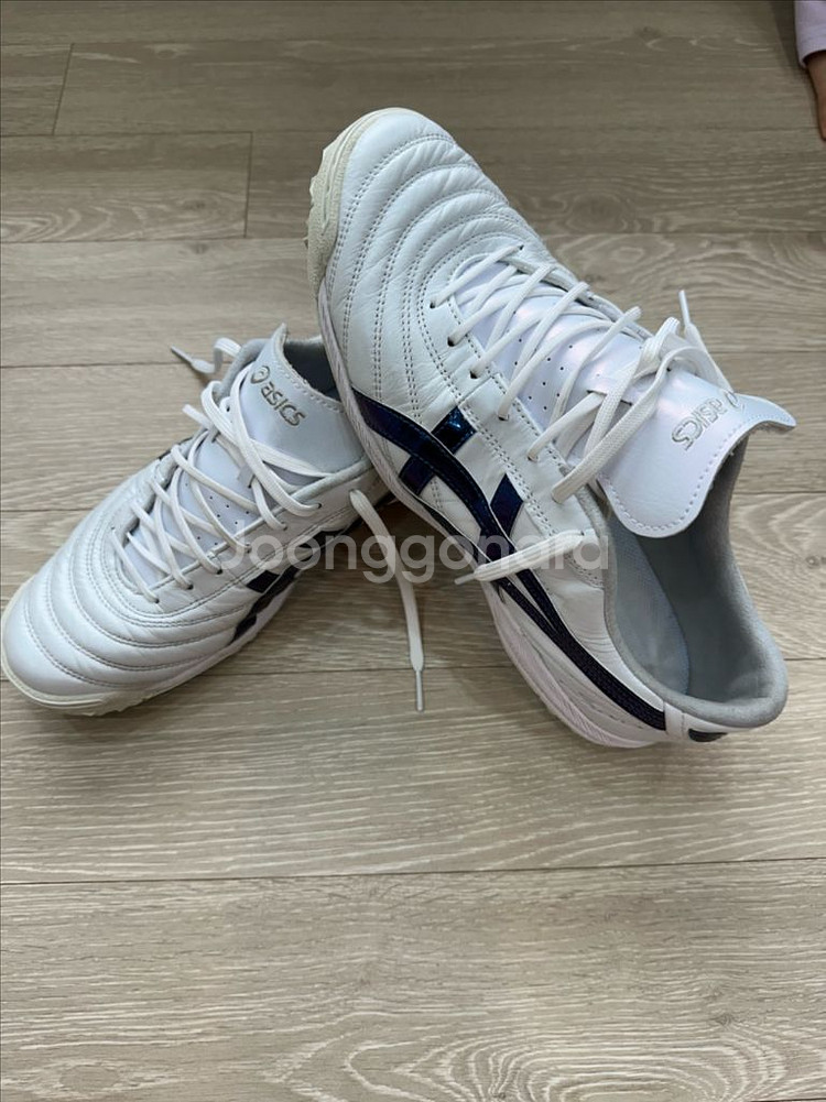 화이트 컬러에 네이비 스트라이프가 포인트인 축구화예요. 전체적으로 깔끔한 상태로 보관되어 있어서 착용감 좋을 것 같아요. 실내에서 사용하기 좋은 모델입니다. 2회착용 상태좋아요