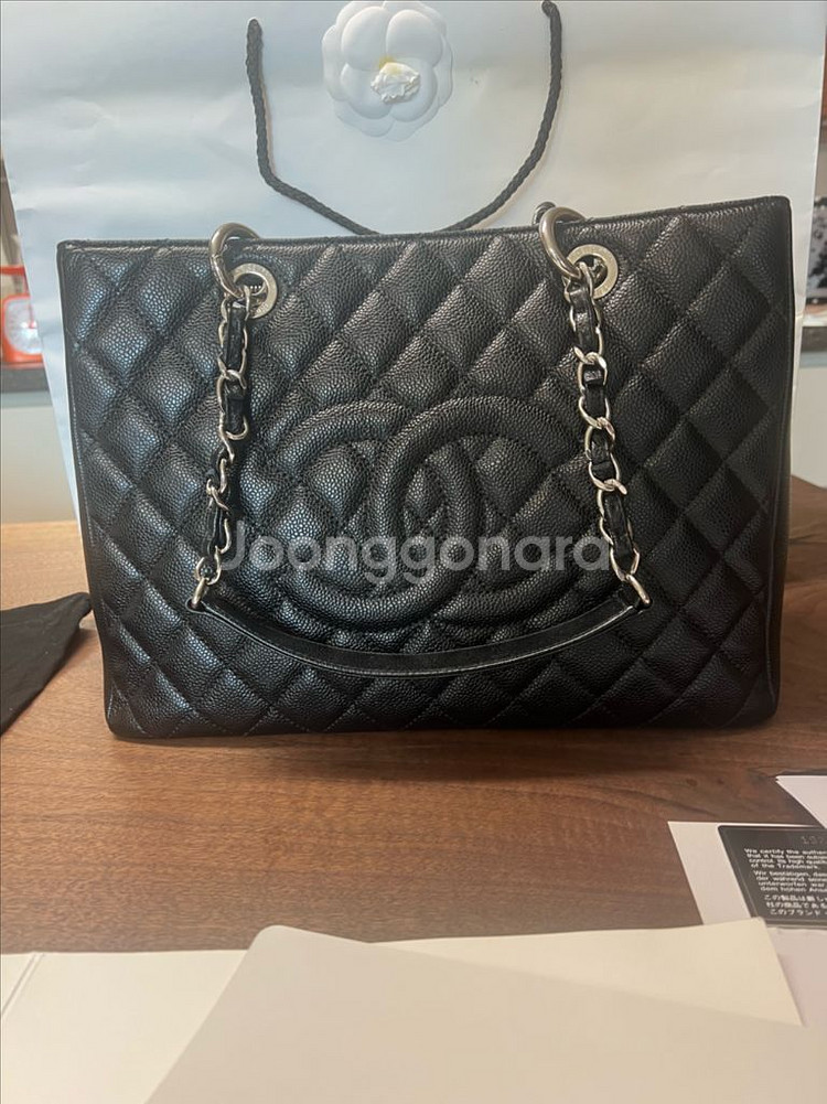 샤넬 그랜드 샤핑 토트백 블랙 캐비어 은장입니다 시리얼 넘버 19번대이구요. 이사오면서 박스를 버려서 280만원에 내놓습니다. 그리고 파리샤넬본점 샤넬깜봉점에서 구매했구요. 깜봉점 구매영수증다 보관하고 있습니다. 사진에서 보시는 것처럼 전체적으로 깨끗하고 좋은 컨디션 유지하고 있어요 넉넉한 수납 공간으로 실용적이며, 캐비어 가죽의 고급스러운 질감과 은장 체인이 조화롭게 어우러져 어떤 스타일에도 잘 어울립니다 더스트백, 쇼핑백, 개런티 카드, 인보이스 등 구매 시 받은 구성품 모두 함께 드립니다.