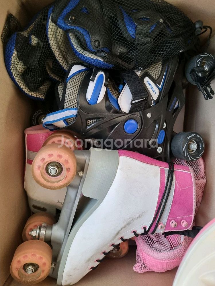 롤러스케이트 여러 켤레와 보호대, 가방 등이 포함된 세트예요. 사용감은 있지만 아직 충분히 사용 가능한 상태입니다. 롤러스케이팅 입문용으로 좋을 것 같아요! 자녀분이 두명이면 안전모등 보호장비다 갖춰져있습니다.(자전거배울때도 필요) 롤러스케이트 분홍색은 한쪽끈이 없어져서 대체하시면됩니다.