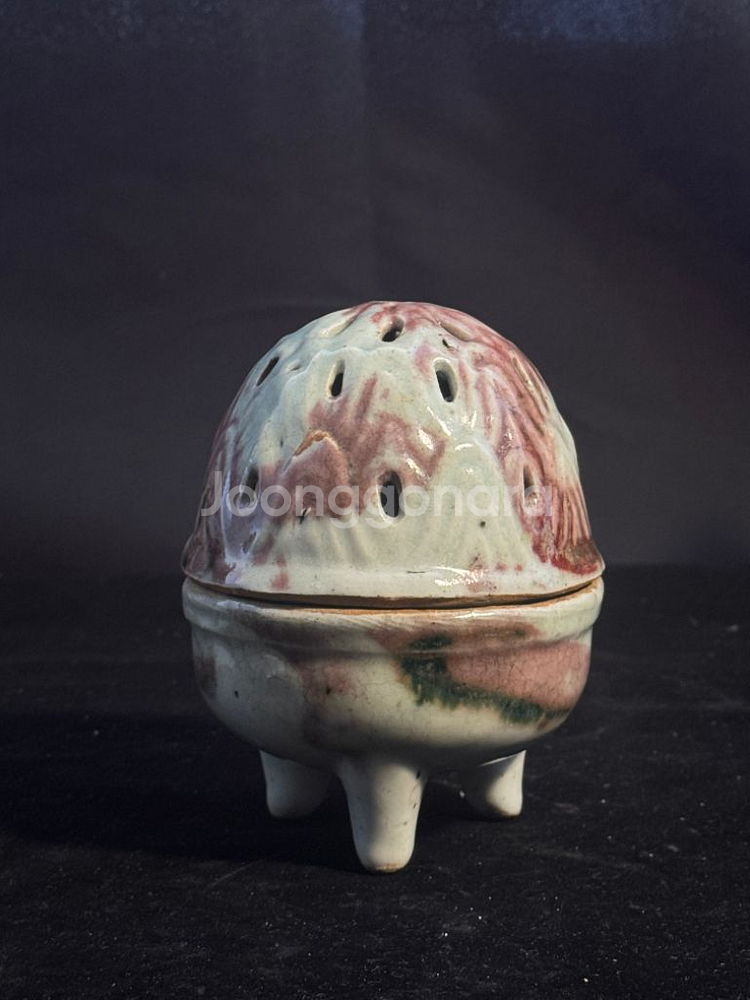 •사이즈 가로:약9센치 세로:약9센치 높이:약13센치 •작품 설명 이 박산향로(博山香炉)는 송대(宋代)에 제작된 백자 향로로, 정교한 투각(透刻) 기법이 돋보이는 작품이다. 박산(博山)은 중국 고대 신화에 등장하는 신령한 산을 뜻하며, 향로의 덮개가 산봉우리 형태를 띠고 있어 그 이름이 붙여졌다. 뚜껑에는 연기를 배출하기 위한 작은 구멍들이 고르게 배치되어 있으며, 전체적인 형태는 조형미와 실용성을 동시에 고려하여 제작되었다. 다리 부분은 세 개의 굽다리로 구성되어 있으며, 기물의 안정감을 높이는 역할을 한다. 송대 백자는 투명한 유약과 우아한 색감이 특징으로, 이 향로 역시 절제된 형태미와 자연스러운 색조가 어우러져 있다. 상단의 붉은색과 녹색 안료의 흐름은 번조 과정에서 자연스럽게 형성된 것으로, 작품의 고풍스러운 멋을 한층 더한다. 이러한 백자 박산향로는 궁중 및 사대부가에서 향을 피우는 용도로 사용되었으며, 도교와 불교 문화의 영향을 받아 신성한 의식과 관련된 중요한 도자기 중 하나로 평가된다. [유의사항] •본 작품은 미감정품으로 진위 여부를 보장할 수 없습니다. •시대 및 연대 언급은 개인 견해에 의한 것입니다. •보관 시 습기 및 직사광선을 피하여 보관하시길 권장합니다. •반품, 교환, 환불이 불가하오니 신중한 구매 부탁드립니다.