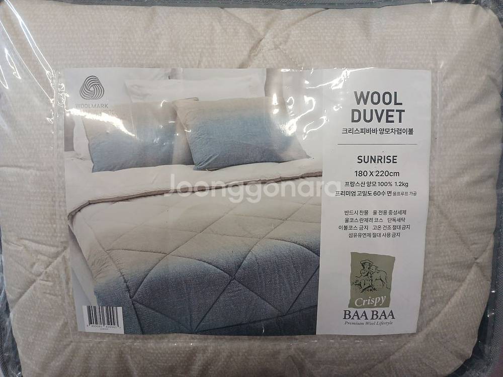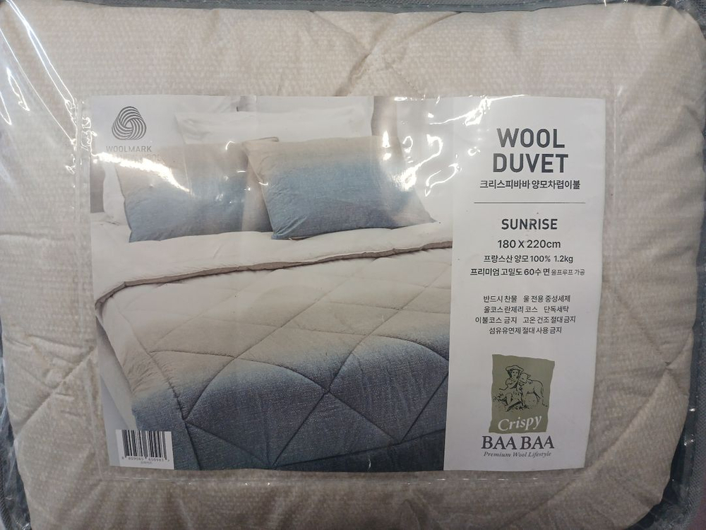 미개봉 새상품입니다 프랑스산 양모 100% 1.2kg으로 제작되었고, 프리미엄 고밀도 60수 면 울프루프 가공으로 부드러운 촉감과 보온성을 자랑합니다 사이즈는 180x220cm로 넉넉하게 사용하실 수 있습니다 미개봉 새상품이라 선물용으로도 좋습니다