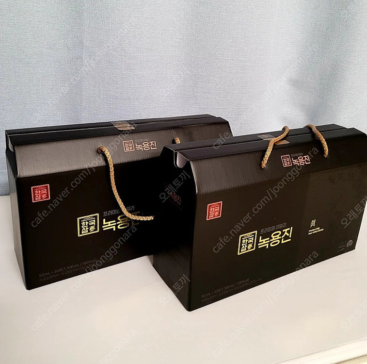 한국삼 프리미엄 녹용진 50ml x 30포 1박스 17000원. 유효기간 27년 5월 택배시 +3500원 3박스 이상시 무료배송 해드려요. (단일배송지 기준 무료배송. 직거래 택배 금액 동일합니다.) 4박스 일괄 66000원 5박스 일괄 80000원 안전결제 가능. 박스에 끈 달려있는 녹용 농축액이라 명절 선물로 좋아요. 택배는 주문하신 다음날 발송가능하고 발송 되는날 오후늦게 운송장번호 알려드릴 수 있어요. 금요일 주문시 다음주 월요일에 발송됩니다.