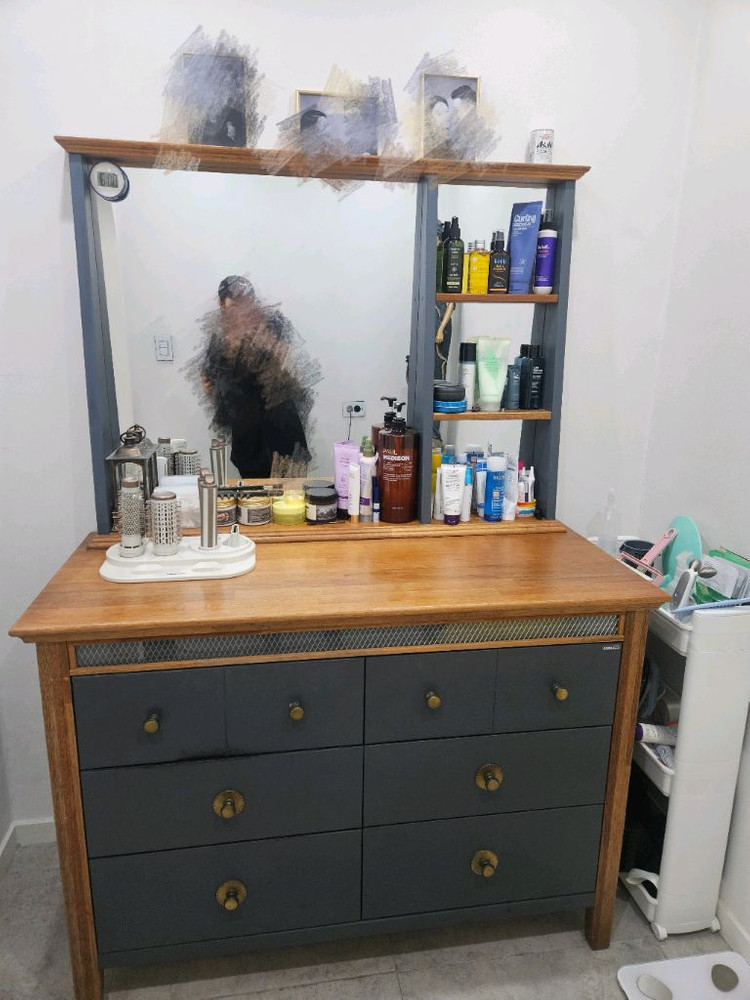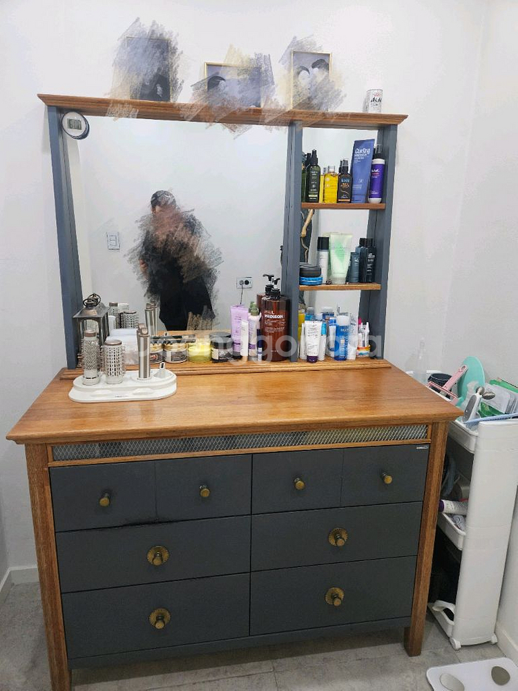 상판은 원목이고, 몸통은 짙은 회색으로 칠해진 화장대 겸 서랍장입니다. 거울이 달려있어 공간 활용도가 높고, 옆에는 화장품 등을 수납할 수 있는 선반도 있습니다. 서랍도 6개나 있어서 수납 걱정은 안 하셔도 될 것 같아요. 문의 없으시면 바로 안전결제해주시면 됩니다!