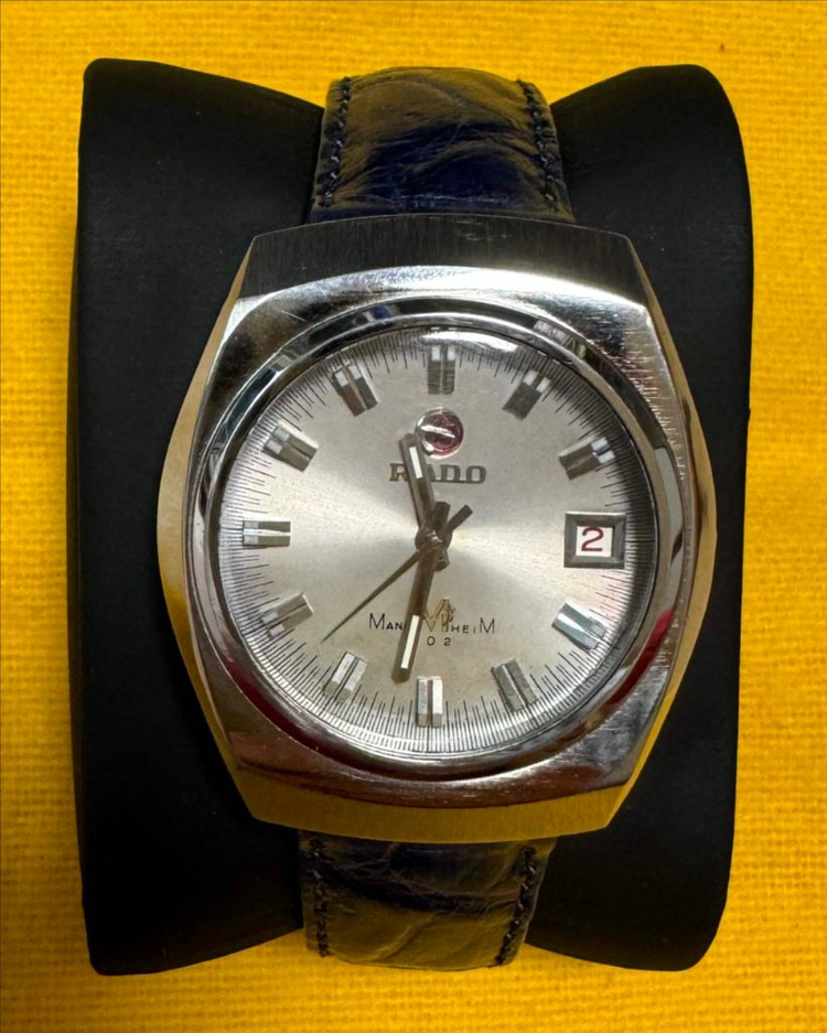 rado mannheim automatic watch 라도 오토매틱 손목시계 입니다. 세월에 비해 아직 깨끗한 편입니다. 시계 케이스의 상태도 괜찮은 편입니다. 70년대 스위스에서 제작한 시계입니다. 47만원입니다. 아래 사진과 영문 설명을 참조하시고 더 궁금하신 점은 전화 또는 문자로 연락주세요. OlO - 38I4 - 55 76 대구입니다. Department ; Men Type ; Wristwatch Band Color ; Blue Band Material ; Leather Band/Strap ; Two-Piece Strap Case Color ; Silver Case Finish ; Gloss Case Material ; Stainless Steel Case Size ; 37 mm Case Thickness ; 12 mm Caseback ; Screwback Country/Region of Manufacture ; Switzerland Dial Color ; Silver Display ; Analog Features ; 12-Hour Dial, Acrylic Crystal, Date Indicator, Swiss Made, Swiss Movement Lug Width ; 18 mm Model ; RADO MANNHEIM Movement ; Mechanical (Automatic) Number of Jewels ; 25 Jewels Watch Shape ; Tonneau/Barrel Year Manufactured ; 1970-1979 Bezel Color ; Silver Bezel Type ; Smooth Indices ; Square Indexes, Stick Indexes