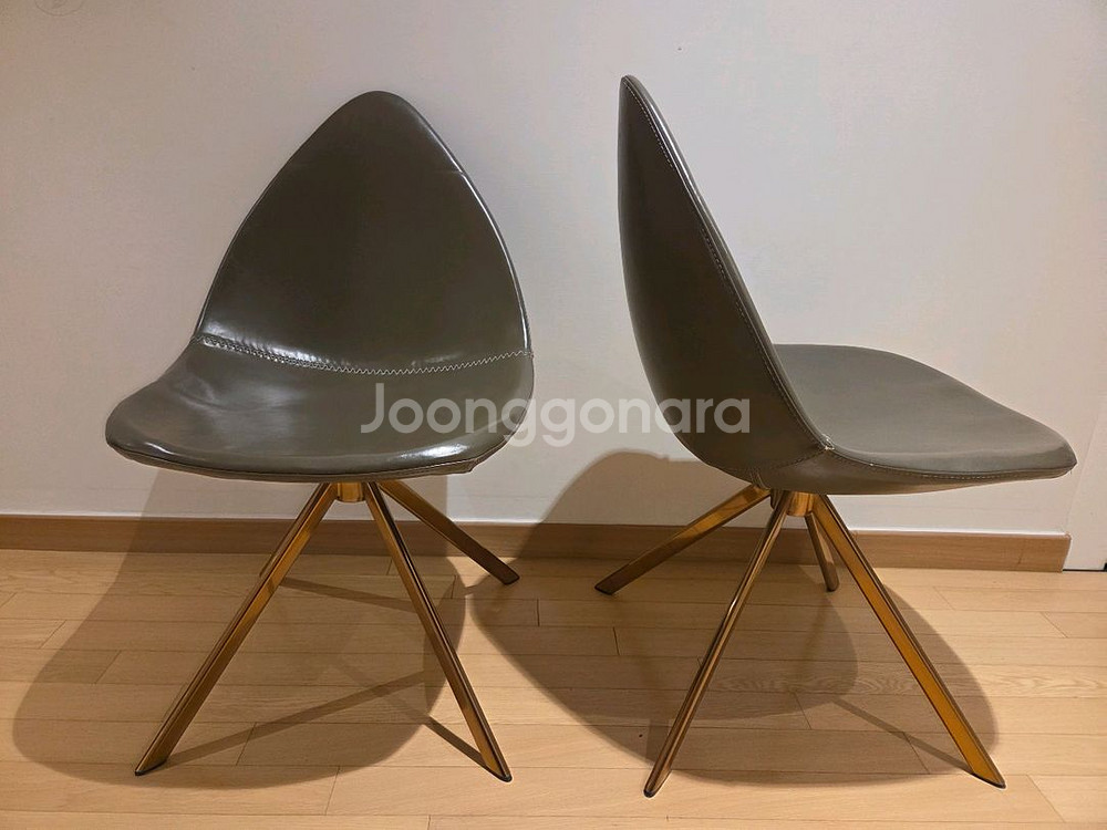 3년전 단비홈에서 구입한 식탁의자 2개입니다. 회색 인조가죽이고 골드 스틸 다리가 포인트입니다. 보컨셉 스타일입니다. 좌우로 45도 회전되고 바로 다시 제자리로 돌아오는 구조예요. 궁금하신 점 있으시면 연락주세요.
