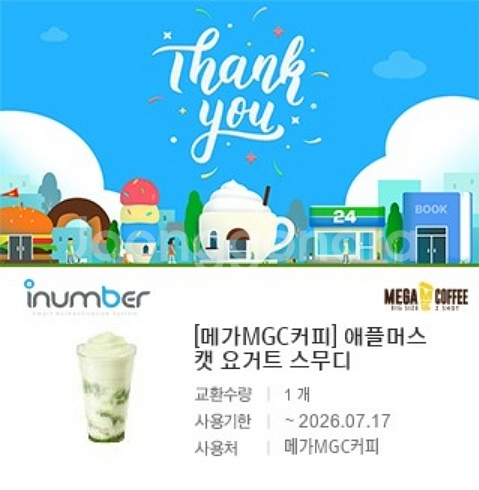 [메가MGC커피] 애플머스캣 요거트 스무디 3900원 -> 3300원 -본 쿠폰은 전국 메가MGC커피 매장에서 사용 가능합니다.(일부 매장 제외) - 사진은 이미지 컷이므로 실제와 다를 수 있습니다. ⁃ 매장별 판매가격은 상이할 수 있으며, 일부 매장에서는 추가금액 결제 후 교 환가능합니다. ⁃타 쿠폰 중복사용이나 포인트 적립 및 제휴카드 할인은 브랜드사 정책에 따릅 니다. - 본 상품 교환시 메가MGC커피 스탬프 적립은 브랜드사 정책에 따릅니다. ?* 브랜드사 정책은 메가MGC커피 앱> 스탬프 > [유의사항]에서 확인 가능합 니다. -본 상품은 매장 내 재고가 없을 경우 동일 가격 이상의 다른 상품으로 교환이 가능하며, 차액은 추가 지불 하여야 합니다 ⁃본 교환권은 메가MGC커피 앱 > 메인 화면 내 [메가월렛] 선택 > [모바일 교환 권 등록하기1 통해 매장 또는 메가오더에서 주문 시 사용 가능합니다 [사용장소] 전국 메가MGC커피 매장에서 사용 가능합니다 단, 아래 매장은 매장 상황에 따라 쿠폰 사용에 제한이 있을 수 있습니다 ⁃ 서울: 건대학생회관점, 동소문점, 강남역점, 여의도파크원점 ⁃ 경기: 용인성복역점 ⁃ 울산: 홈플러스 울산점 ⁃ 경남: 김해롯데워터파크점, 김해공항국내선점 쿠폰 전송이후 취소환불변경 불가 에눌 문의에는 답하지 않아요~