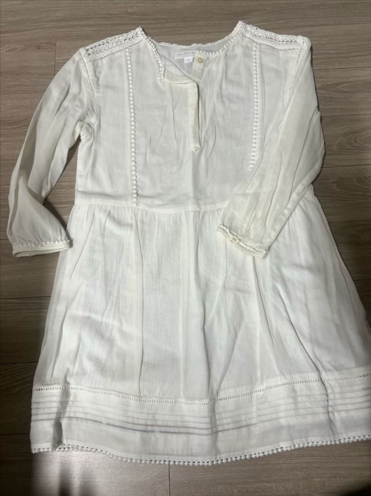 버버리 키즈 정품 화이트 컬러의 레이스 디테일이 예쁜 원피스예요. 어깨와 사이드에 레이스 장식과 도트 패턴이 있어서 로맨틱하고 우아한 느낌이 나네요. 전체적으로 깨끗헌 상태로 보관되어 있어요. 드라이 완료.