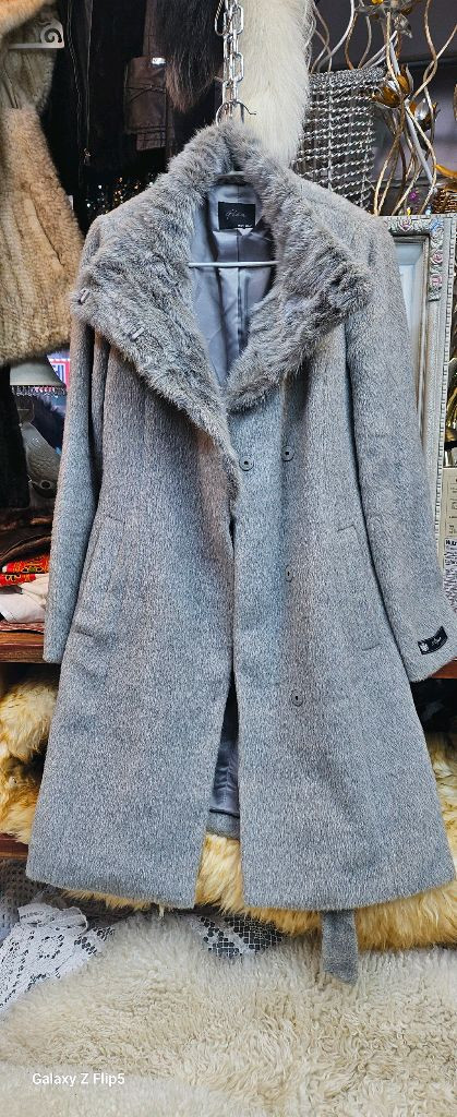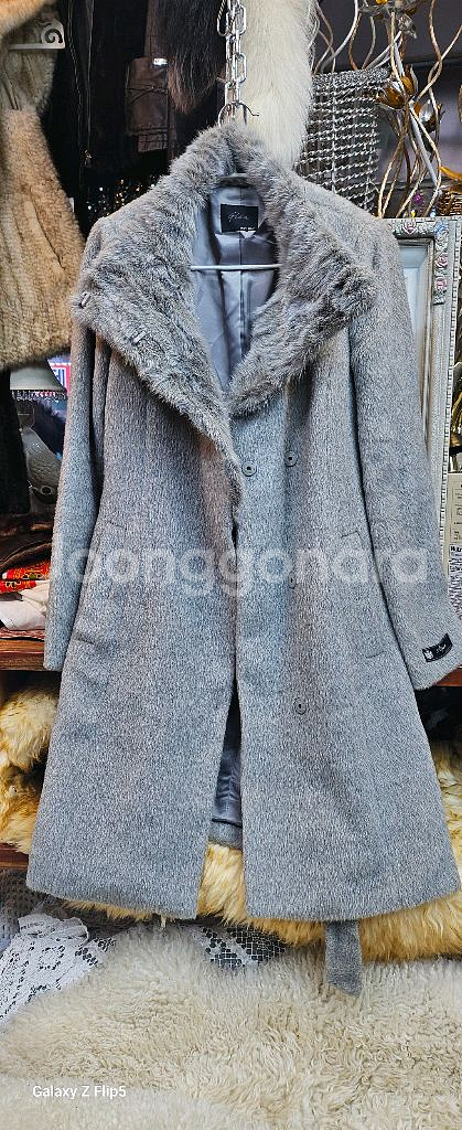고급스러운 그레이 컬러 롱코트예요. 목 부분에 퍼 트리밍이 있어서 따뜻하고 우아한 느낌이 나며, 전체적으로 상태가 양호해 보입니다.