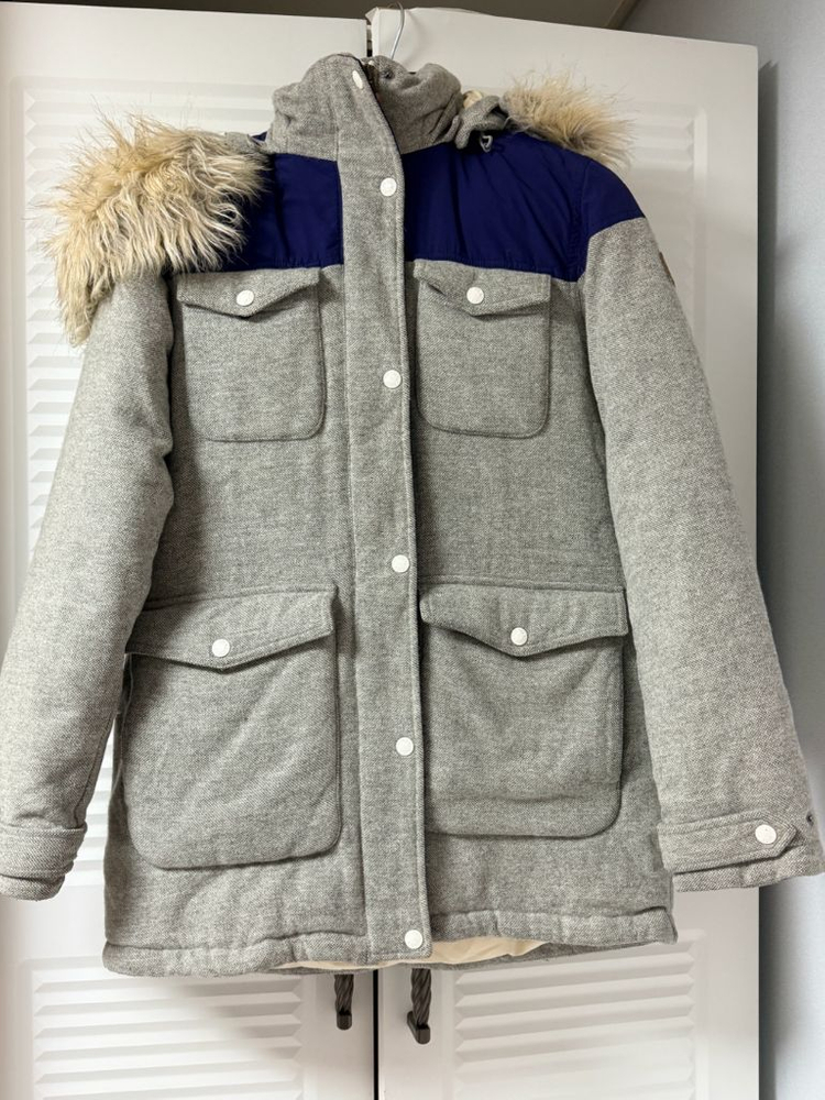 그레이 컬러에 네이비 배색이 포인트인 패딩 점퍼예요. 후드에 퍼 트리밍이 있고 여러 포켓이 있어 실용적입니다. 전체적으로 깔끔한 상태로 겨울철 착용하기 좋아요.