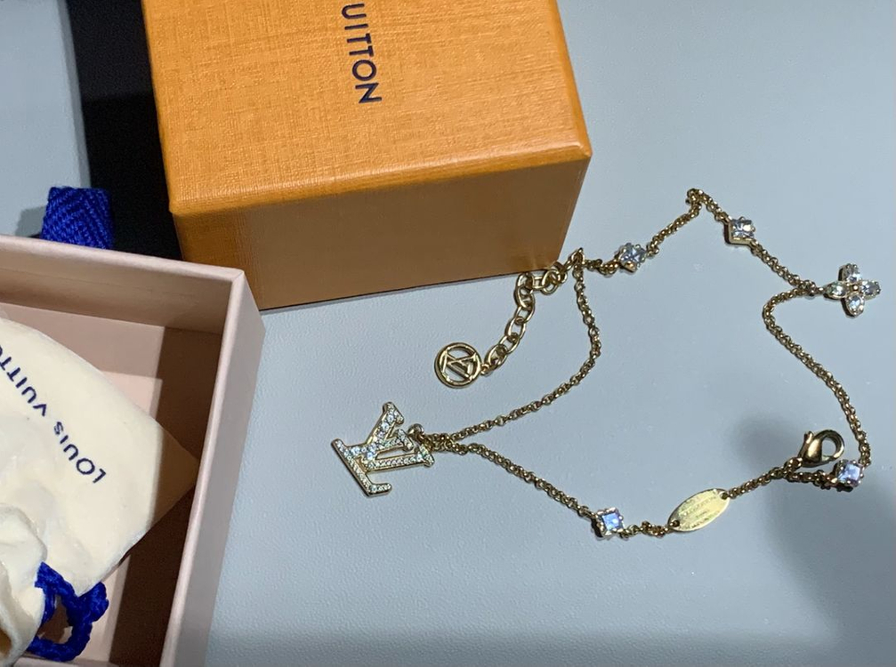 루이비통 레이디 LV 팔찌 골드 색상 M1582A 모델입니다 LV 이니셜과 모노그램 플라워 참이 특징이며, 반짝이는 큐빅 장식이 더해져 화려하면서도 우아한 분위기를 연출합니다 조절 가능한 체인으로 손목 사이즈에 맞춰 편안하게 착용할 수 있습니다 정가는 1,010,000원이며, 박스와 더스트백 모두 포함되어 있습니다 구매후 잘 착용하지 않아 판매합니다