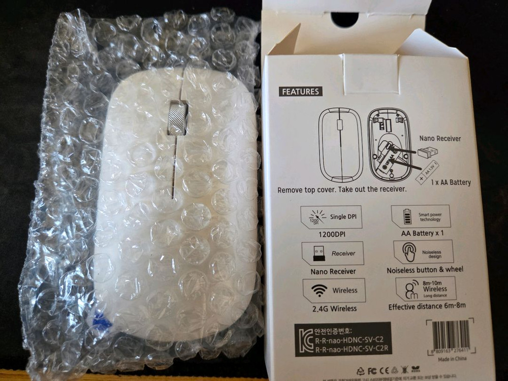 새상품 무선 마우스 판매합니다 화이트 색상으로 깔끔하고, 1200DPI를 지원하며 무소음 버튼과 휠로 조용하게 사용할 수 있어요 2.4G 무선 연결 방식으로 최대 8-10m 거리에서도 안정적으로 작동합니다 AA 배터리 1개가 들어가며, 나노 리시버가 포함되어 있습니다 KC 인증도 완료된 제품입니다