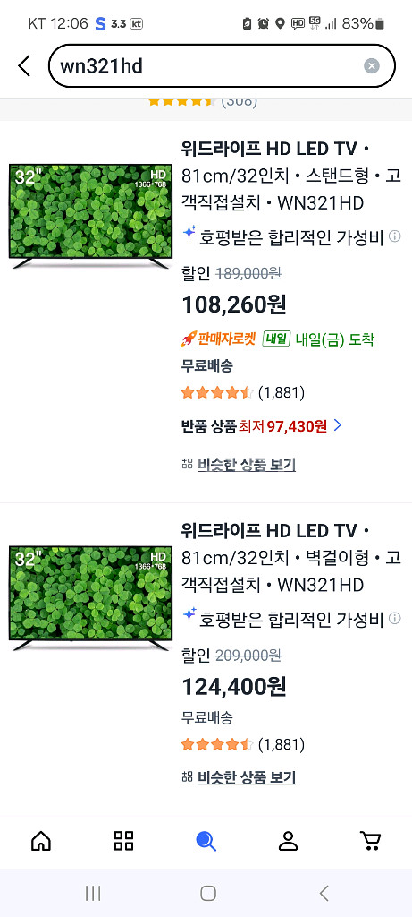 구매 후기 및 가성비 아주 좋습니다. 위드라이프 HD LED32인치 TV (품명 : WN21HD) 100% 미개봉 + 신상품입니다. 가전제품은 구매후기가 중요합니다. 모든 물품은 택배비 (최소 8~10,000원예상) 5,000원만 받겠습니다.(CU 롯데택배) 가격은 택배비 제외 가격입니다. 거래 후 택배접수는 바로가능합니다. 동부산이나 일부 인근은 편의상 퇴근길에 가져다 드릴 수도 있습니다.(지역한번 줘보세요.) (단,출발전 1만원 헛걸음방지 받고출발함) > 저는 택배기사가 아닙니다이^^;;; 매너부탁드림. (현관앞까지 갔다달라는등,무리한 요구는 X입니다.) 구매하시거나 필요한 문의 하실분은 연락 부탁드립니다. 중고가 아니고 "미개봉" "새제품" 입니다. 이유있는 네고는 가능합니다. 개인거래 물품 특성상 교환 & 환불 불가능합니다. (근데 진심 걱정안하셔도 됩니다.) 직거래는 만난 뒤, 현장네고 절대불가합니다. 거래안합니다. 매너거래 당부드립니다. 카드할인? 회원가 포함해도 어디서 구입하시던 이게 전국최저가입니다. 편하게 문의 부탁드립니다. (늦어도 꼭 답드림)