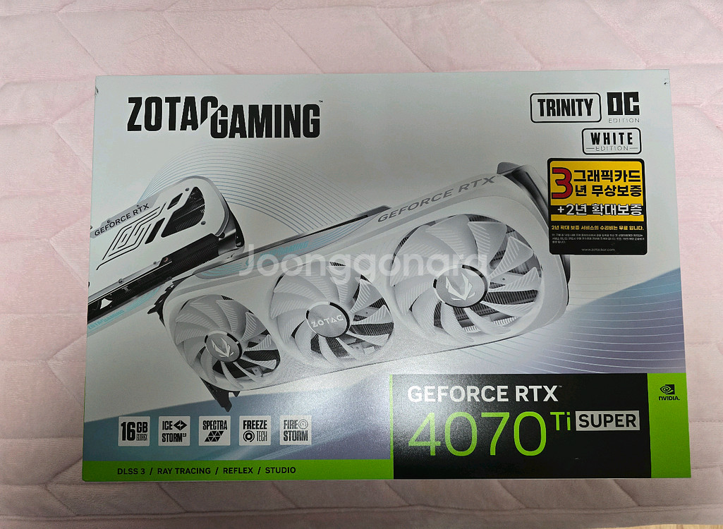 * 제품 : Zotac RTX 4070 Ti SUPER 트리니티 화이트 * 구입 : 24년 12월 (A/S : ~27년 11월, 제조 : 24년 7월) * 깨끗하며 상태 좋음 (흡연 X / 애완동물 X) 정상작동 확인했으며 중고거래 특성상(단순변심 등) 거래 후 환불은 안되니 구입 전 사용중인 케이스 크기, 장착 파워 등 확인 필수 직거래 우선 : 광주 남구 월산동 (평일 : 저녁 6시~) 네고 X (관련 문의시 답변 X)