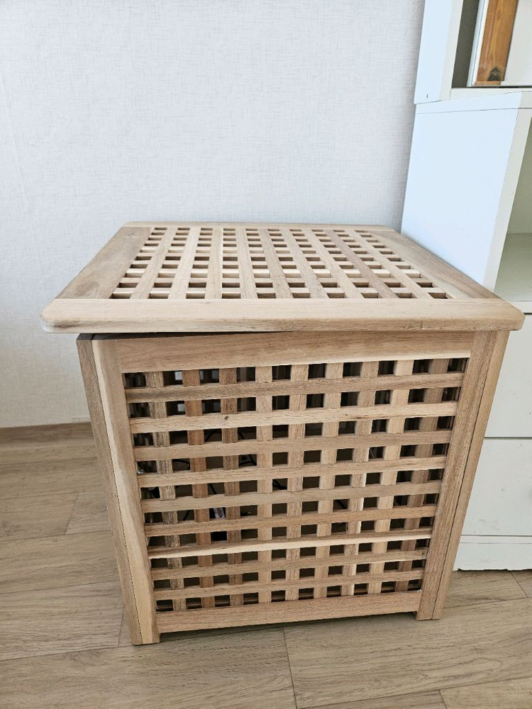 원목으로 제작된 청소용 바스켓이에요. 격자 패턴의 디자인으로 통풍이 잘되고 실용적입니다. 사용감은 있지만 기능상 문제없이 깨끗하게 관리되었어요. 직접 들구가셔야해요