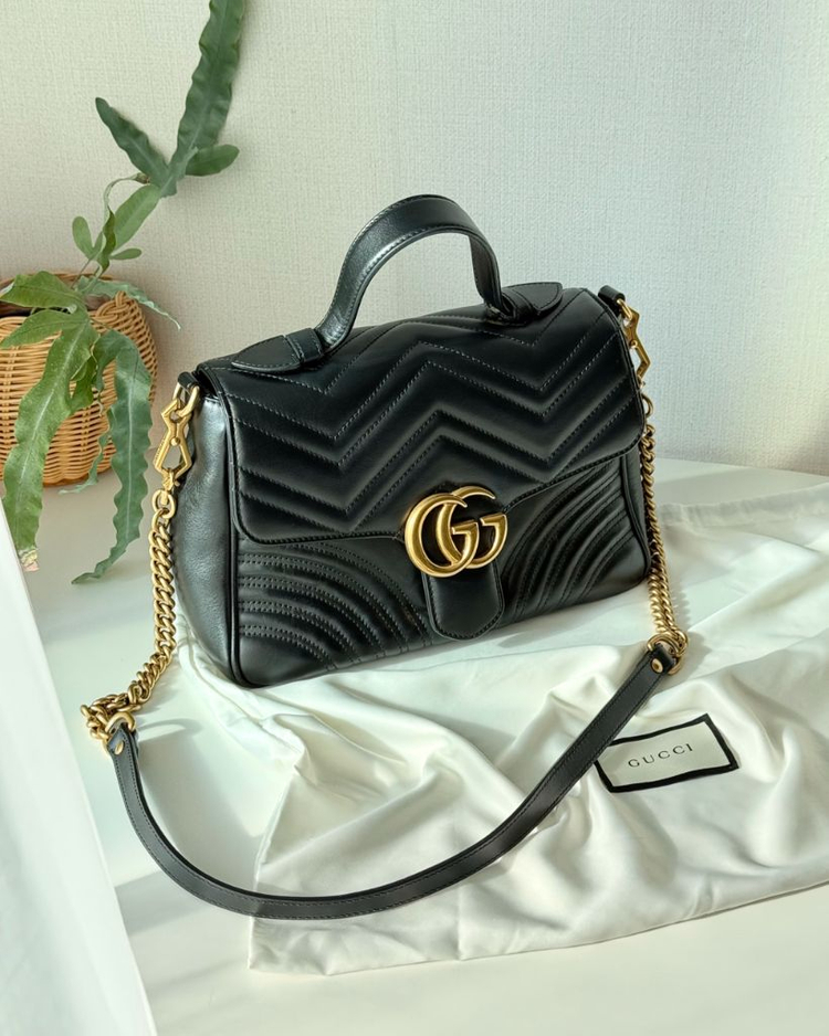 모델명 : 구찌 GG 마몽 마틀라세 탑 핸들백 색상 : 블랙 상품번호 : 498110 DTDIT 1000 사이즈 : 스몰 (약 26.5x17x10cm) 상태 : A 구매시기 : 2021 / 신세계백화점 구성품 : 본품, 더스트백 구찌 마몽 마틀라세 탑핸들 백입니다 고급스러운 소재감과 디자인이 돋보이는 구찌의 대표 백 라인으로 많은 사랑을 받고 있습니다 빈티지 골드톤 금장 로고의 느낌과 자연스럽게 에이징되는 가죽 질감이 시간이 지날수록 고급스럽게 느껴지는 매력이 있어요 :) 21년도 신세계백화점 구매로 중요한 날만 착용하여 실사용 횟수 많지 않으며 전체적으로 깨끗한 컨디션 유지 중입니다 바닥면 모서리 부분과 금장부 미세 스크래치와 같은 자연스러운 사용감 외에 큰 하자 없습니다 본품, 더스트백 있습니다 구매시기 고려하여 매우 저렴하게 책정했습니다 고이비토 온라인 감정 완료, 요청 시 사진 전송해드려요 * 중고 물품 특성 상 반품은 불가합니다 상품 등급표 - 새상품 : 미사용 새상품 - 새상품급 : 단순시착 또는 실착 횟수 3회 미만 - S : 사용감 거의 없고 전체적인 컨디션 매우 좋음 - A+ : 사용감은 있으나, 상처나 얼룩이 거의 없음 - A : 사용감이 있고, 상처나 얼룩이 보이지만 심하지 않음 - B : 사용감도 있고 얼룩이 눈에 보임 - C : 오래된 상품이며, 사용감도 있고 얼룩도 심함