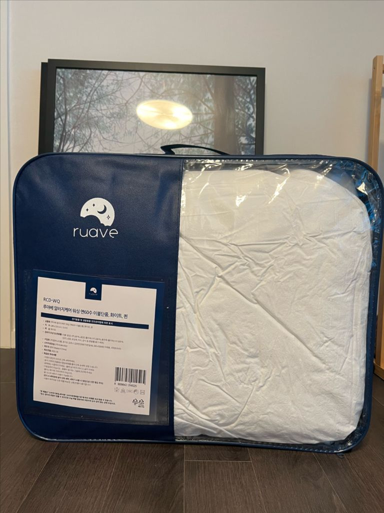 루베나 알러지케어 면60수 이불입니다. 사이즈는 퀸(180x210)이며 화이트 컬러 입니다. 제품 확인만 하고 다시 넣어둔 미사용 새제품입니다.