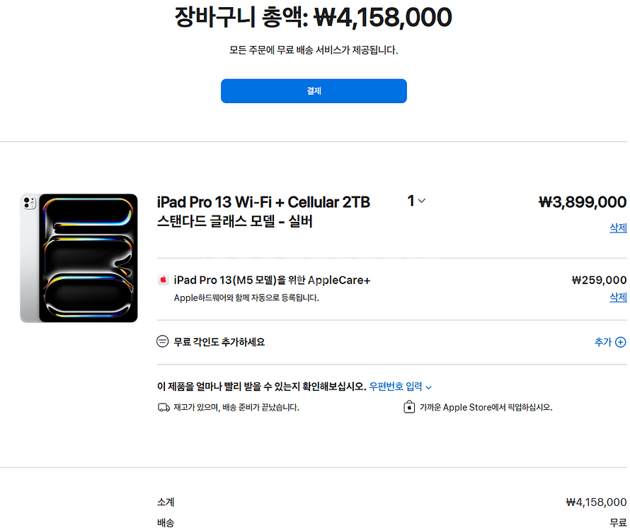 아이패드 프로 13 Wi-Fi + Cellular 2TB 스탠다드 글래스 모델 실버 색상 판매합니다. AppleCare+가 포함되어 있으며, 애플코리아에서 정품입니다 매직키보드 화이트 46만에 판매하고 있습니다