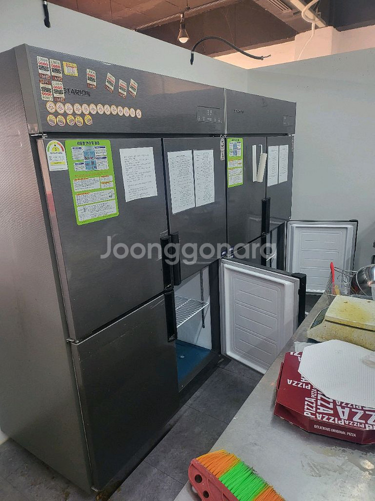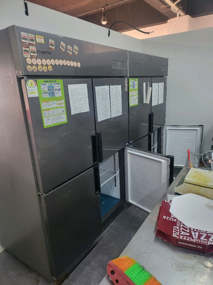 업소용으로 사용하던 대형 냉장고예요. 여러 문이 있어서 수납공간이 넉넉하고, 업소나 식당에서 사용하기 좋습니다. 사용감은 있지만 정상 작동하는 상태입니다. 대전 2023년제조 스텐 올냉동100만 냉동2냉장2 90만 두개하시면180만드려요 대전은배송해드려요 쪽지주세요