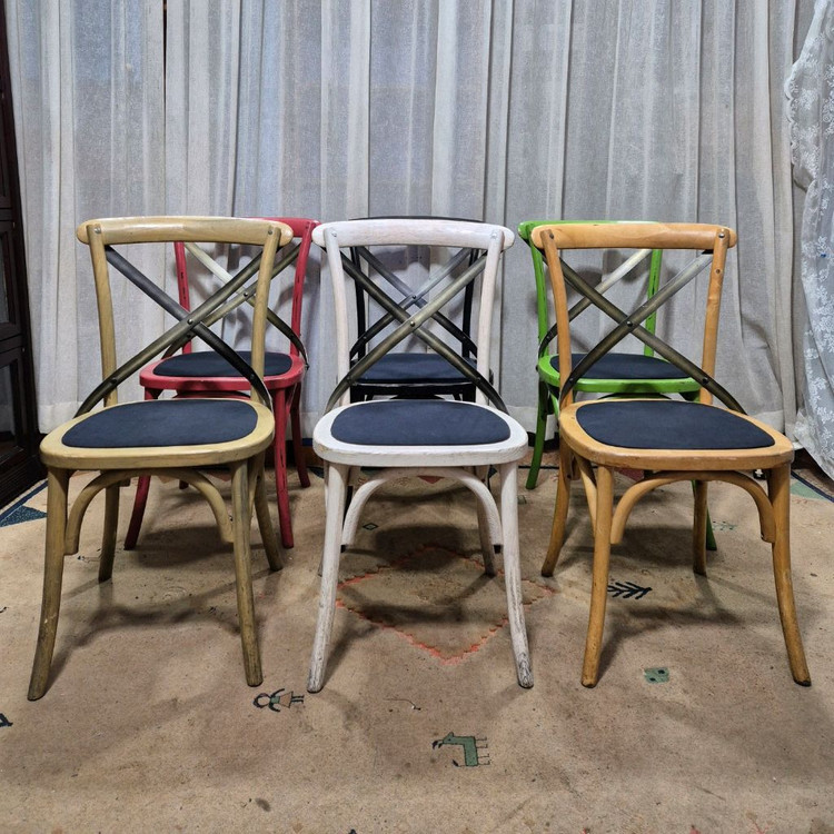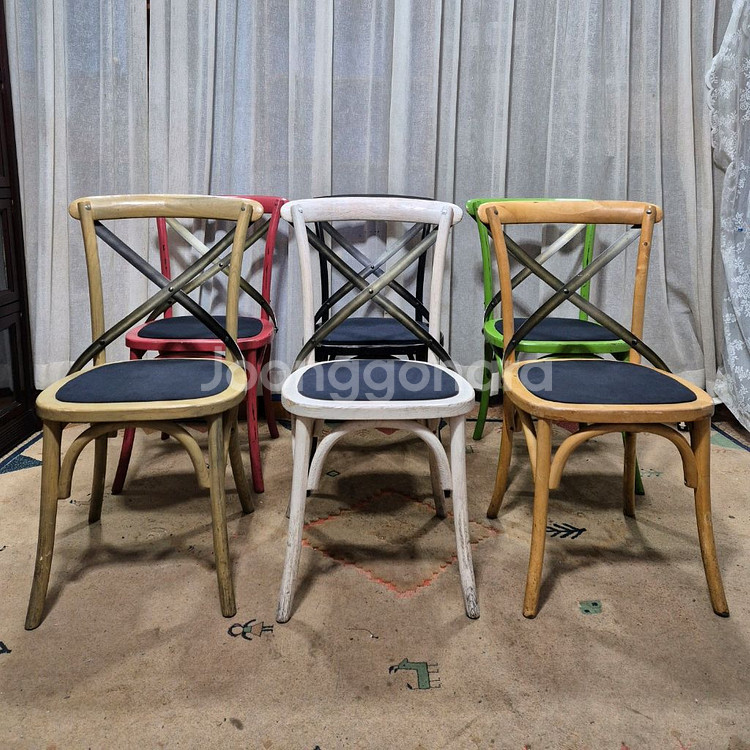 인테리어 빈티지 크로스백 체어 사이즈 가로 45 깊이 50 높이 89cm 앉는부분까지 높이 46cm 수량 : 블랙10 메이플8 레드4 그린3 화이트3 원목2 가격 개당 5만원 지역 잠실 배송 착불 교환 x 환불 x