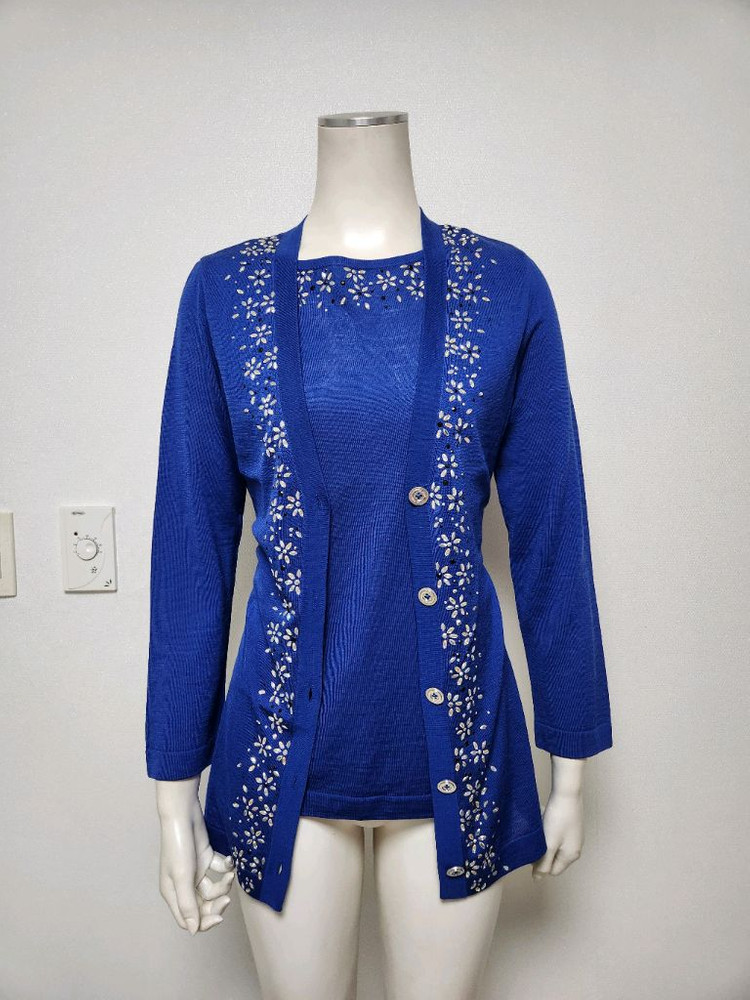 예쁜 블루 컬러의 플라워 자수 니트 세트예요. 가디건과 민소매 상의로 구성되어 있고, 화이트 꽃 자수가 포인트가 되어 여성스러운 느낌이 물씬 나네요. 상태 양호한 중고 제품입니다. 센죤 니트 조끼 + 가디건 세트, 새옷 사이즈는 P 이고 조끼의 가슴 반품은 42센치 총장은 60센치 입니다만 니트라서 늘어나서 실측 보다는 넉넉하게 입으실 듯 합니다 비즈손상 전혀없고 뒷목점에 ST JOHN 마크가 조끼와 가디건에 붙어 있습니다 푸른 곤색이고 비즈가 단색이 아니고 오묘하게 화려합니다 세트 판매가격이 10만원 입니다 종이 택이 실수로 떨어졌네요 교환 환불은 번거로와서 사양합니다