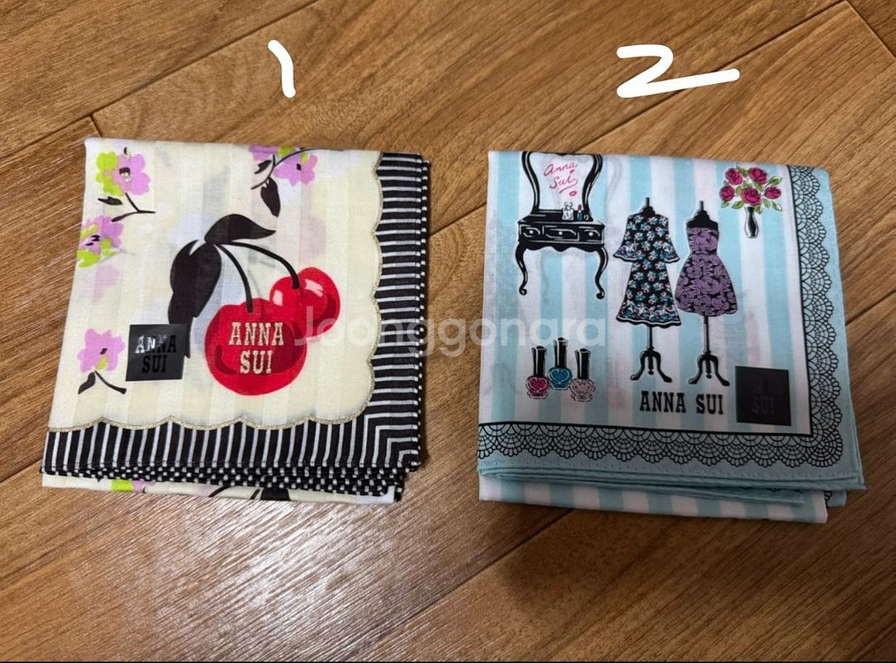안나수이 손수건입니다. 일본 백화점에서 구입한것입니다. 1. 아이보리 바탕에 체리 패턴 2. 하늘색 바탕에 드레스 패턴 - 면 100% 소재로 부드럽고 흡수성이 좋습니다 - 사이즈는 50x50cm로 활용도가 높아요 - 손수건으로 사용해도 되지만 쁘띠 스카프로 활용하거나 가방에 묶어서 포인트를 주어도 좋아요. - 사용하지 않은 새제품이라 선물용으로도 좋습니다 - 원하시는 포장지에 동봉해 드립니다 하나당 25000원입니다.