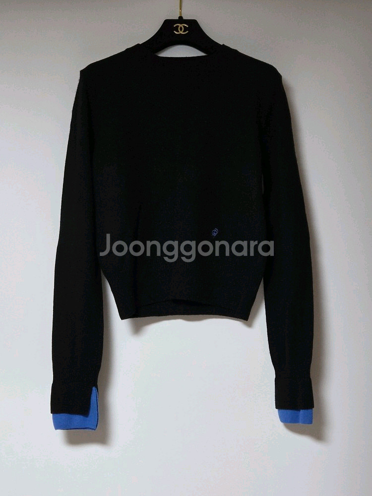 세련된 디자인의 구호플러스 kuho plus 크롭 니트 2023년 매장 구입 22년 8월 제조 제품 소재 나일론 54, 모 42, 캐시미어 4% 택 기재 1사이즈, 82-92-160으로 실측 가슴 반품 44.5, 기장 50.5cm 소매 부분 블루 색상과 앞쪽 로고 자수 포인트 드라이 완료해서 바로 착용 가능 앞쪽 옷걸이에 겹쳐서 걸어 놓은 자국 살짝 있음