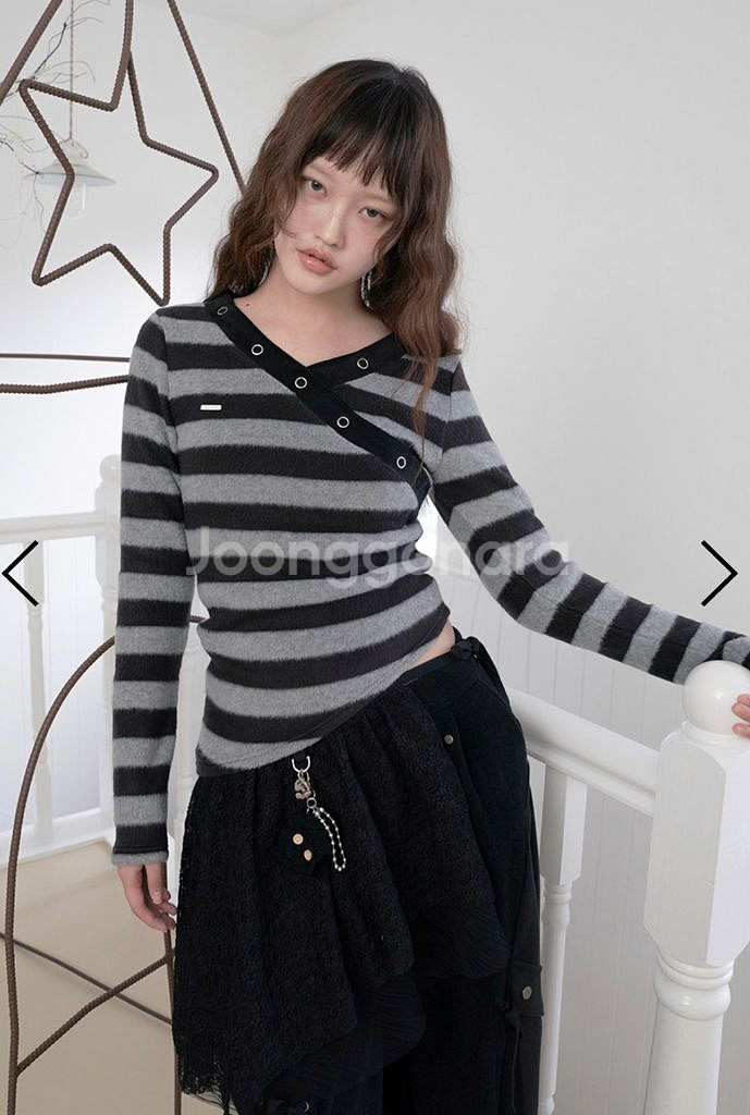 허그유어스킨 스트라이프 니트입니다. 브이넥 라인에 디테일이 더해져 유니크한 느낌을 줍니다. 어깨 40 가슴 37 밑단 39.5 총장 48 / 62 소매 64