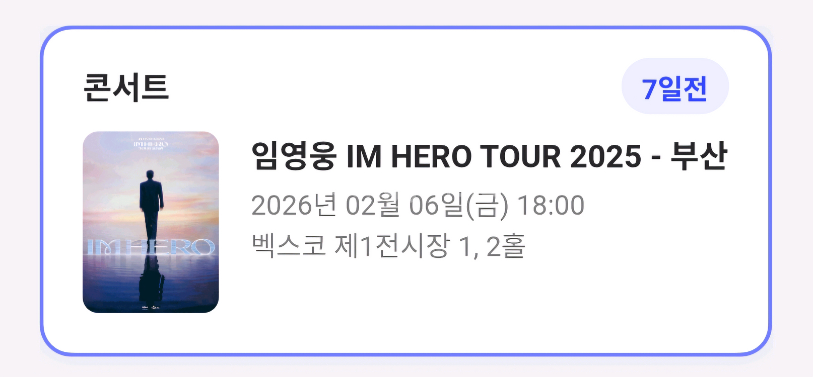 임영웅 IM HERO TOUR 2025 부산 콘서트 티켓 양도합니다. 2026년 2월 6일(금) 오후 6시 벡스코 제1전시장 1,2홀에서 진행되는 공연입니다. 좌석은 PEACE석 사구역 14열 3번입니다.