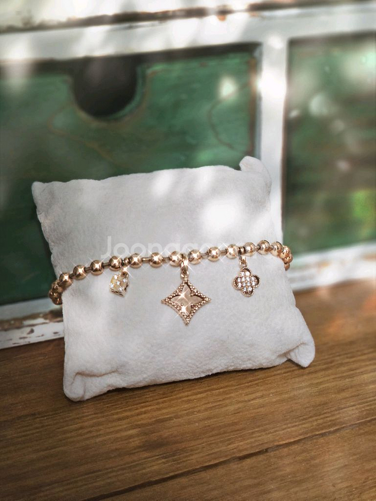 18k 로즈 골드 소재의 고급스러운 루이 참달린 볼 팔찌예요. 13.48g 정도입니다. 다양한 모양의 참들이 달려있어서 스타일링하기 좋고, 상태도 깔끔해 보여요. 데일리로 착용하기 딱 좋은 아이템입니다.
