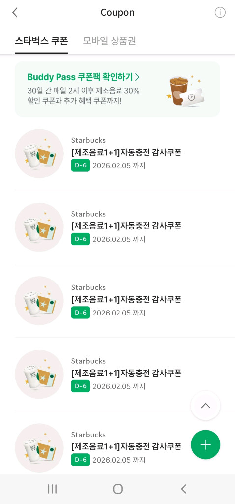 사이렌오더 가능. e쿠폰으로 전송해요. ~*~*~*~*~*~*~*~*~*~*~*~* ㅡ스타벅스 제조음료 1+1 보고 쿠폰 동일한음료 동일사이즈 1잔 구매시 1잔 추가증정. 벤티음료까지 가능. 프리엑스트라1은 구매음료 1잔만 가능. 3200원 2월5일까지 사용가능 4장씩 하시면 3000원 가능해요