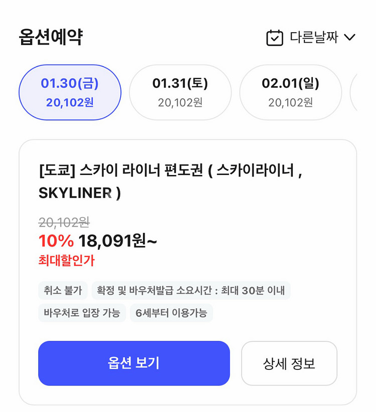 도쿄 스카이 라이너 편도권 기프티콘 판매합니다 10% 할인된 가격인 18,091원에 구매 했고, 장당 17,000원에 총 4장 판매합니다. (성인 2명이 왕복으로 이용) 구매 후 취소는 불가하며, 바우처로 입장 가능합니다 7월까지 사용가능합니다.