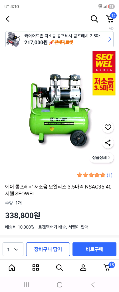 3.5마력 에어 콤프레샤 팝니다. 상태 양호하고 정상 작동하는 제품입니다. 작업용이나 공구용으로 사용하기 좋습니다. 생각보다 많이 쌥니다. 금액은 19만원입니다. 구매하실분은 톡 주세요.