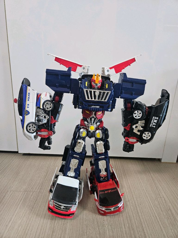 헬로카봇 펜타스톰 5단 합체 변신로봇입니다 5대의 자동차가 합체하여 로봇으로 변신하는 제품이에요 사용감이 적고 깨끗한 상태이며, 변신 설명서도 함께 드립니다 다만 댄디 구급차 왼쪽 룸미러가 파손되어 빨간색 카봇 드래곤 로봇 서비스로 같이 드립니다