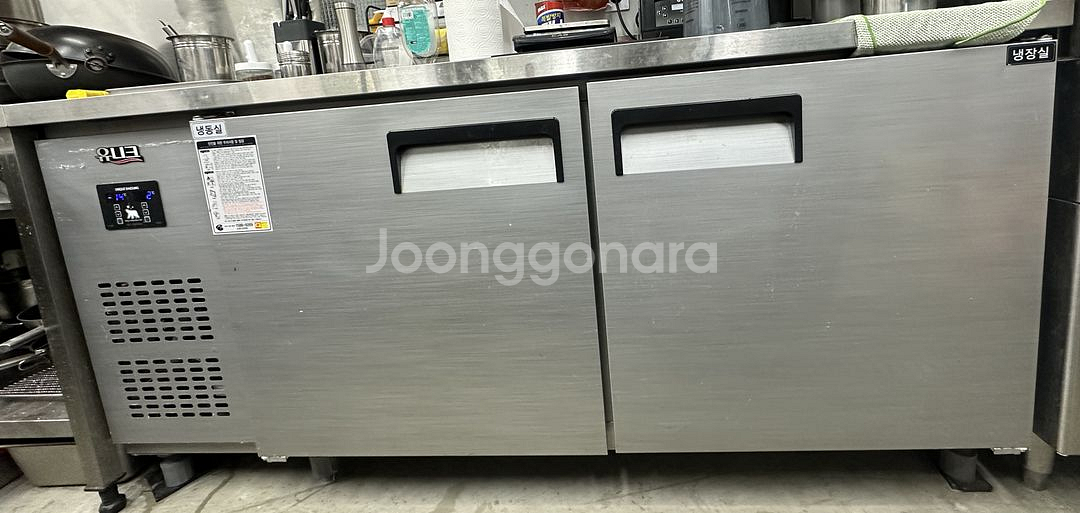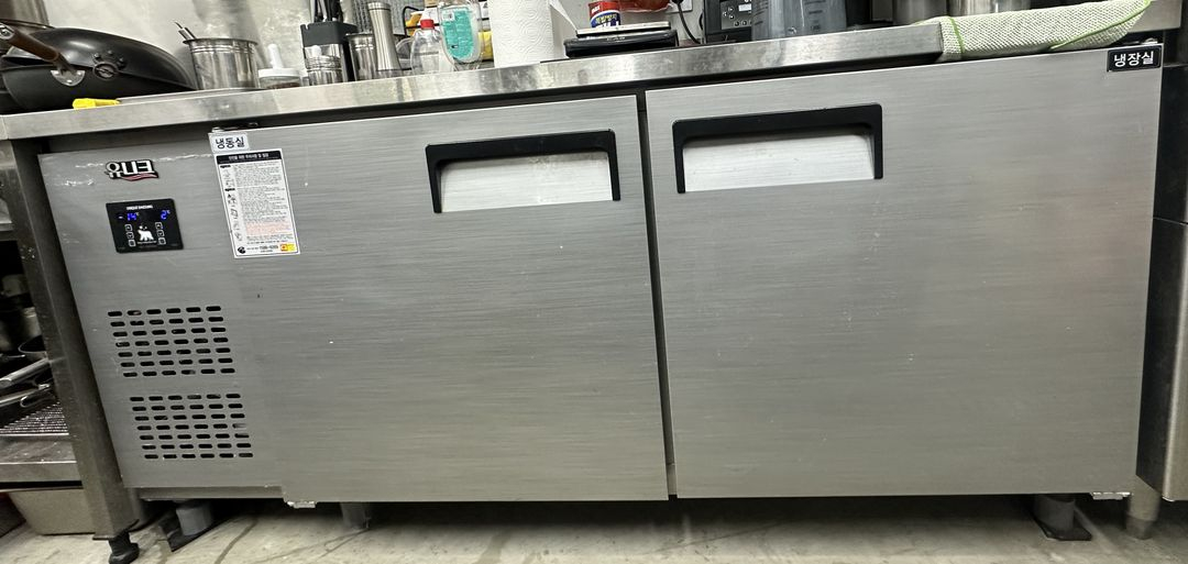 업소용 냉장냉동고예요. 스테인리스 소재로 견고하고 2도어 구조로 사용하기 편리합니다. 업소나 카페 운영하시는 분께 좋을 것 같아요. • 상품명(브랜드): 냉장,냉동 반반 테이블 (유니크) • 모델명: 직냉 1800 • 구매 시기 (년, 월, 일): 23년 6월경 • 사용 기간: 2년 8개월 • 하자 여부: 정상 작동 적정선 네고 가능
