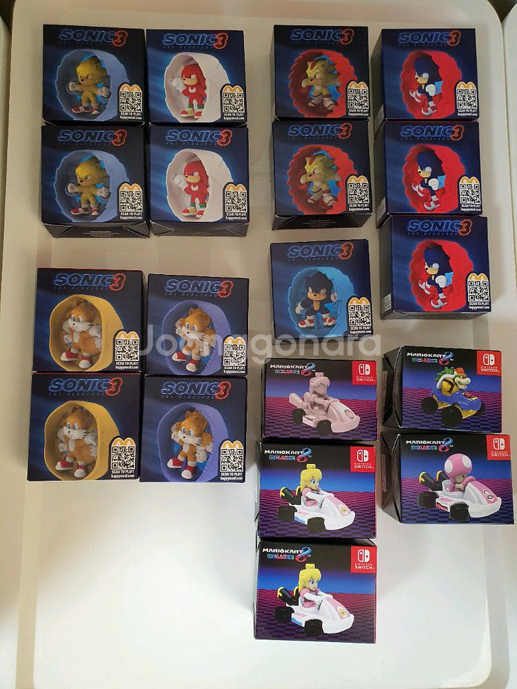 해피밀에 들어있던 완구류 팝니다. 소닉, 슈퍼마리오 등 사진 속 전체이구요. 일괄 3만원 에다가 편의점 택배(선불)로 보내드립니다. 참고로 미개봉은 아니에요 스티커 사용한 것도 있고 아닌것도 있고... 각개판매 안합니다.